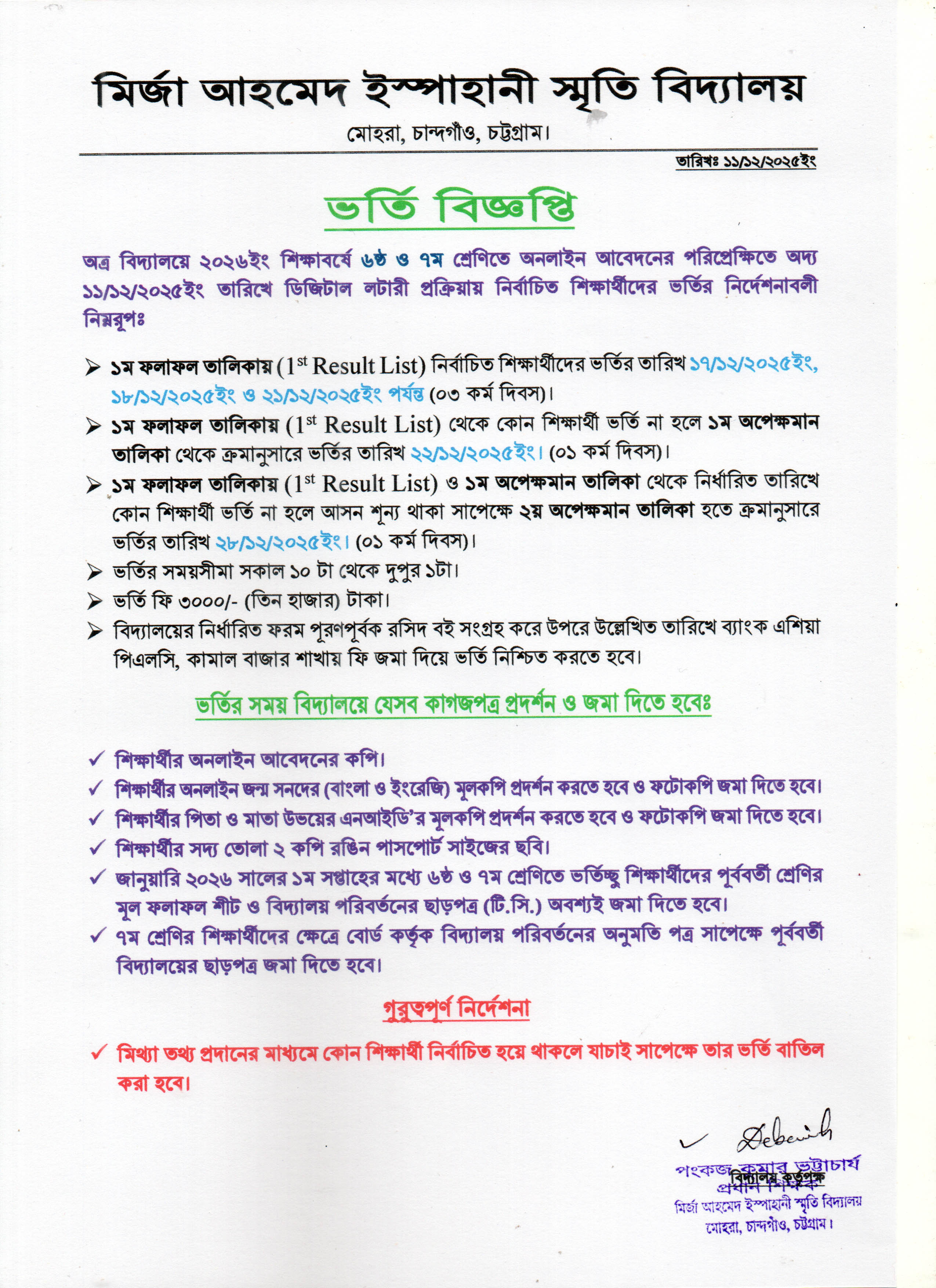 ২০২৬ইং শিক্ষাবর্ষে ৬ষ্ঠ ও ৭ম শ্রেণিতে লটারীর ফলাফলের ভিত্তিতে ভর্তি সংক্রান্ত বিজ্ঞপ্তি