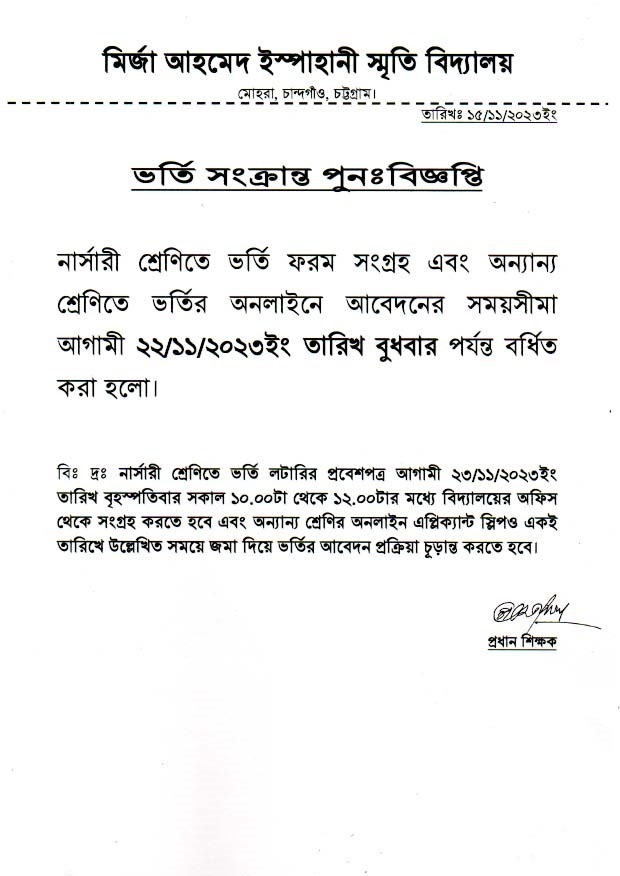 অনলাইন ভর্তি আবেদন সময় বর্ধিত করন ২০২৪ইং। |
